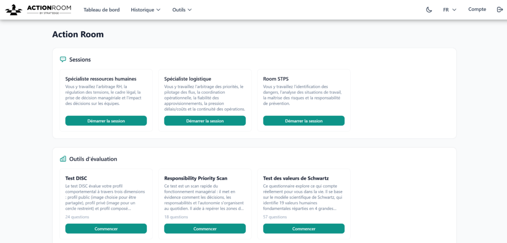 Action Room fonctionne directement dans votre navigateur. Les participants se connectent en quelques secondes sur ordinateur, tablette ou smartphone.